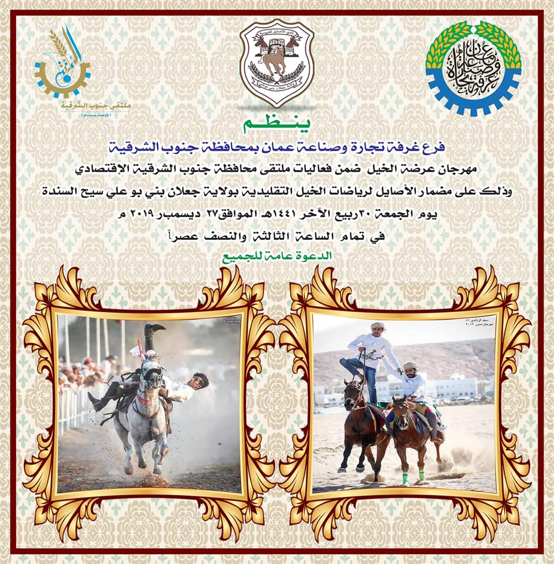 مهرجان عرضة الخيل ضمن فعاليات ملتقى محافظة جنوب الشرقية الاقتصادي وذلك على مضمار الاصايل لرياضات الخيل التقليدية بولاية جعلان بني بو علي سيح السندة يوم الجمعة الموافق 27/12/2019م في تمام الساعة الثالثة والنصف عصرا...