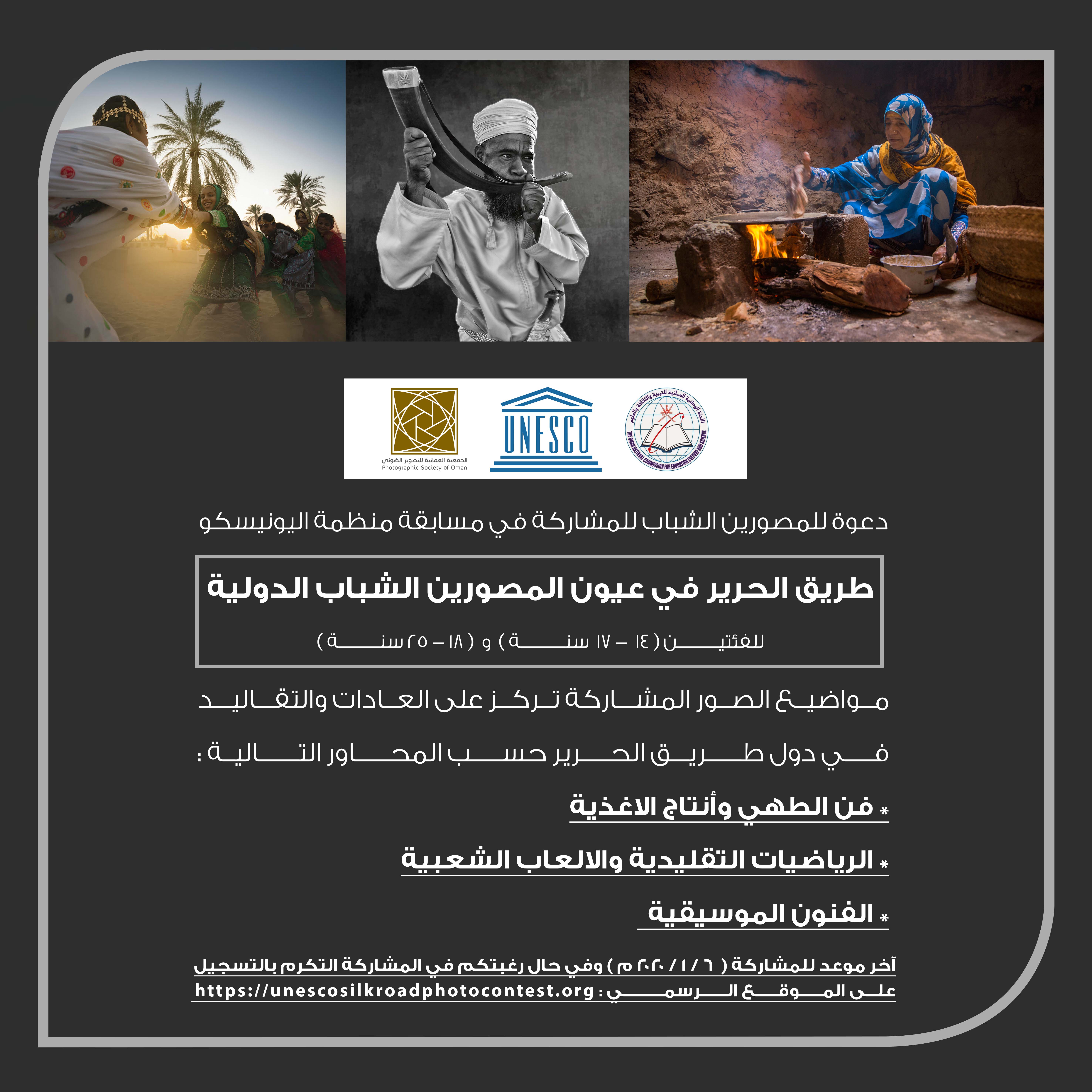 طريق الحرير في عيون المصورين الشباب الدولية للفئتين 14-17 سنة 18-25 سنة مواضيع الصور المشركة تركز على العادات والتقاليد في دول طريق الحرير حسب المحاور التالية -فن الطهي وإنتاج الاغذية - الرياضات التقليدية والألعاب الشعبية - الفنون الموسيقية آخر موعد للمشاركة 6/1/2020م التسجيل على الموقع ...